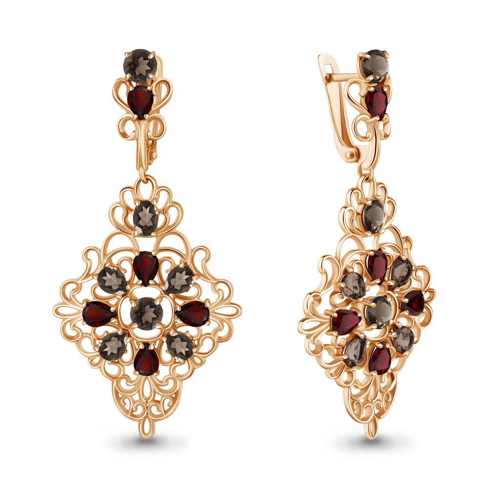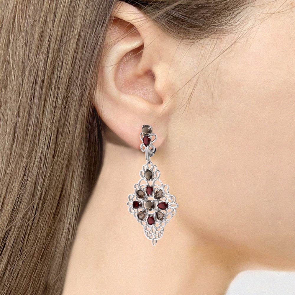 4448101 Серьги из Серебра с гранатами, кварцами дымчатыми
