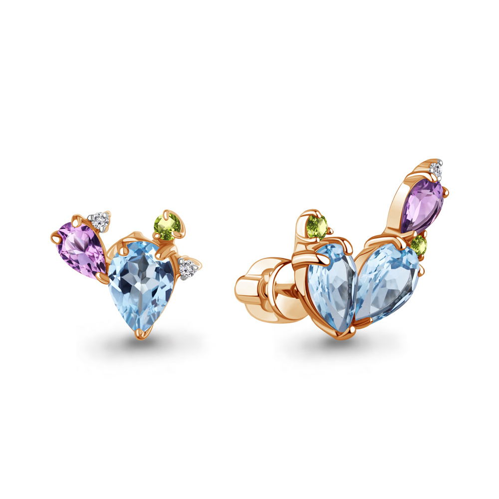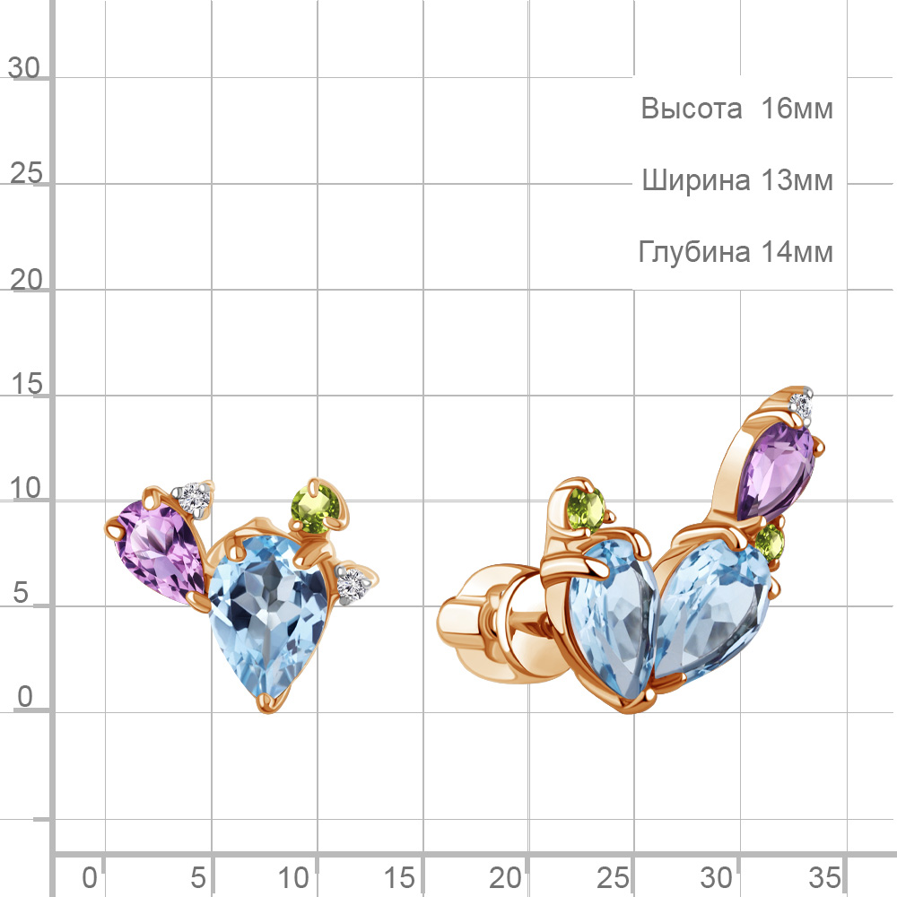 45022240 Серьги из Серебра с аметистами, топазами свисс блю, фианитами, хризолитами