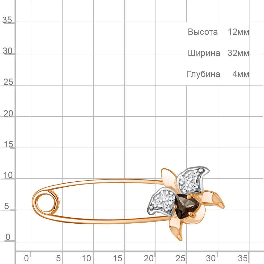 7748901А Булавка из Серебра с кварцем дымчатым, фианитами