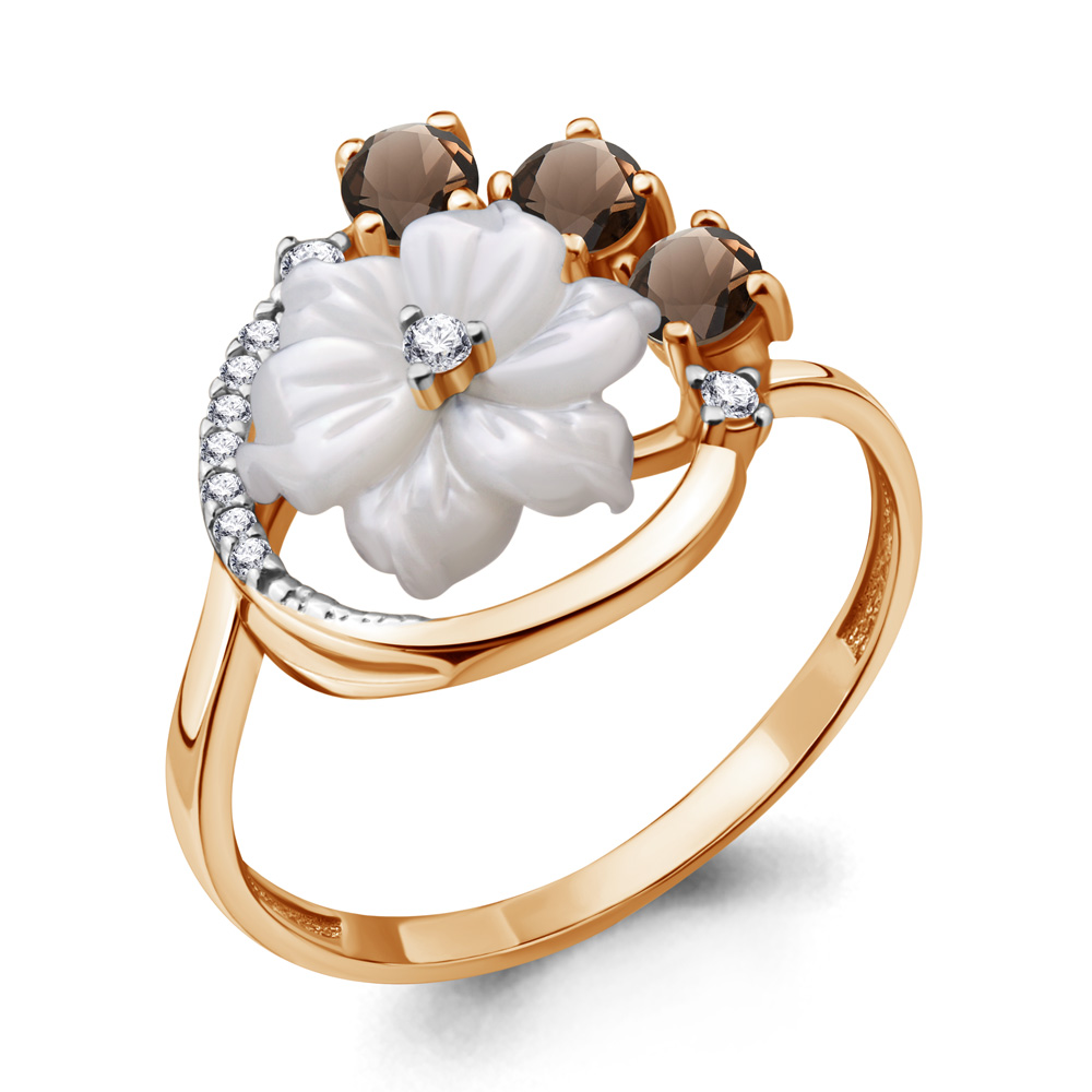 6570701А Кольцо из Серебра с кварцами дымчатыми, поделочным камнем, фианитами из коллекции "Жозефина"