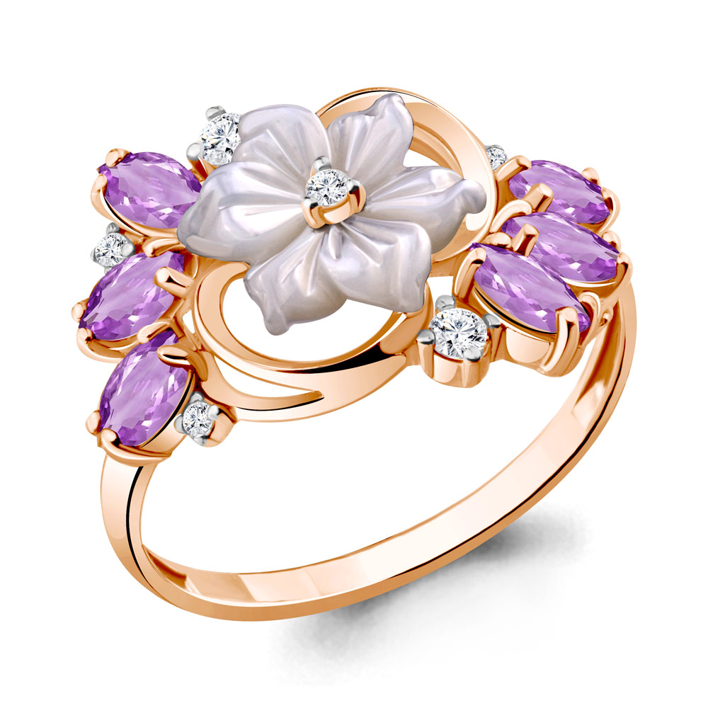 6571504А Кольцо из Серебра с аметистами, поделочным камнем, фианитами из коллекции "Жозефина"