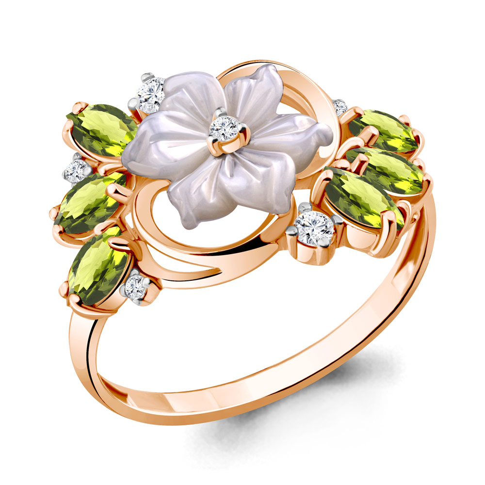 6571507А Кольцо из Серебра с поделочным камнем, фианитами, хризолитами из коллекции "Жозефина"