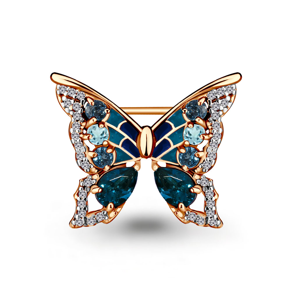 7267166А Брошь из Серебра с топазами лондон блю, топазами свисс блю, топазами скай блю, фианитами, эмалью