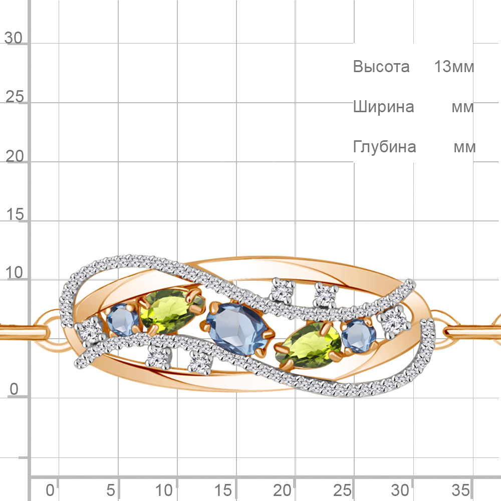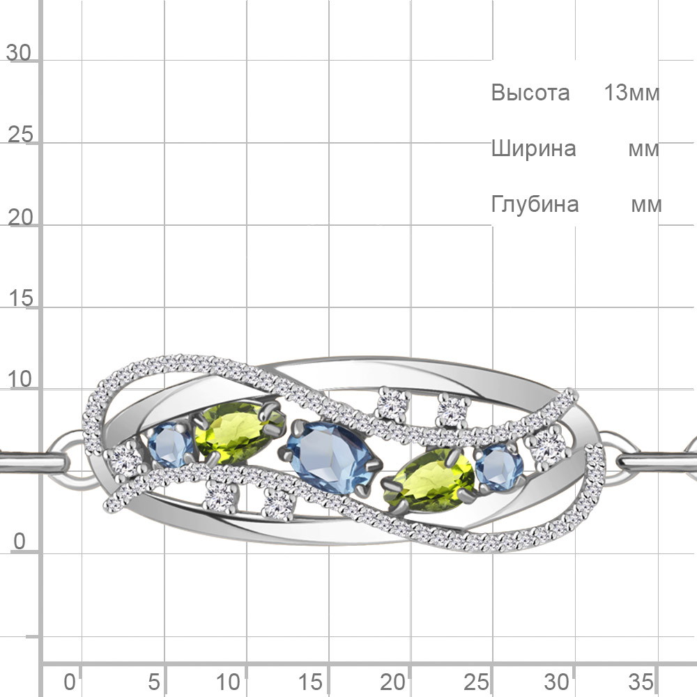 Описание камней 1 Топаз Свисс Блю; 2 Топаз Свисс Блю; 2 Хризолит; 66 Фианит; 4 Фианит; 2 Фианит