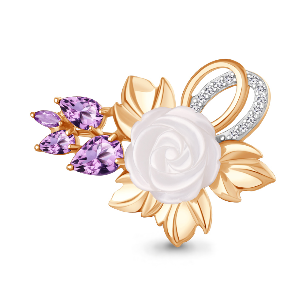 7746504А Брошь из Серебра с аметистами, поделочным камнем, фианитами