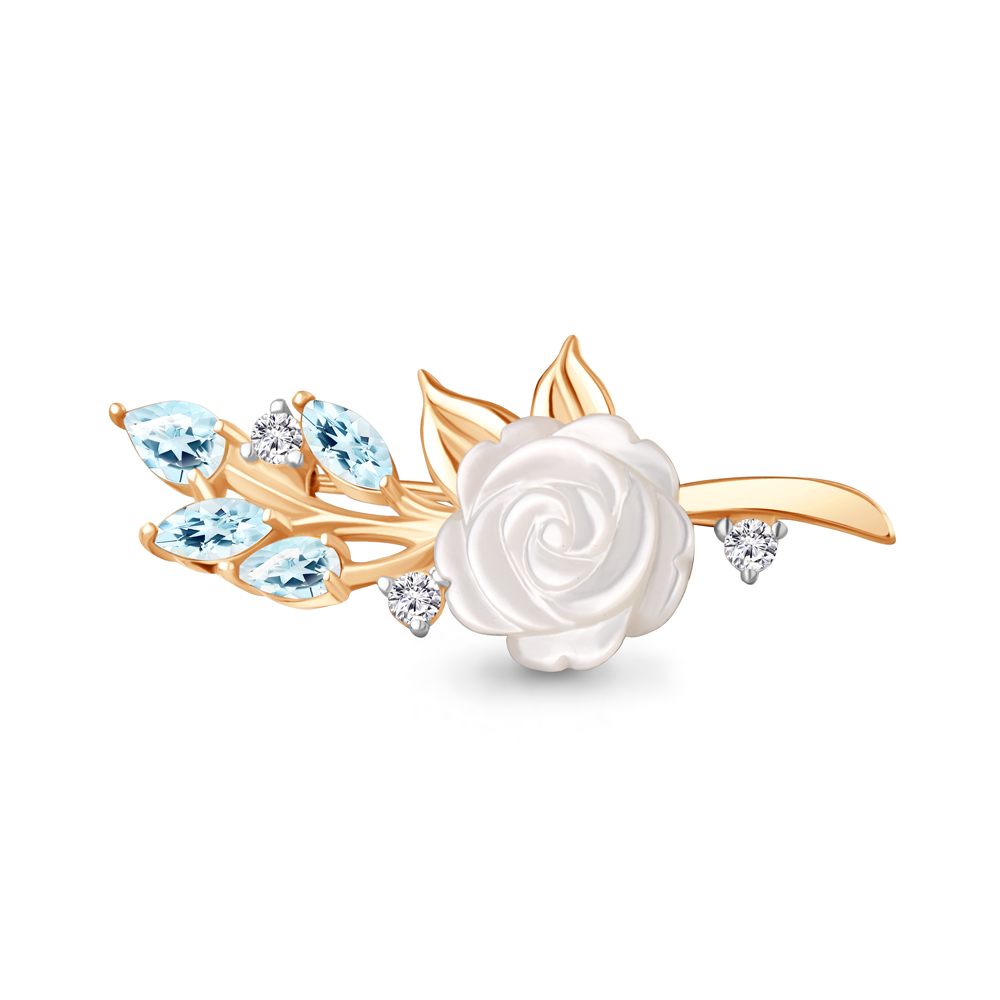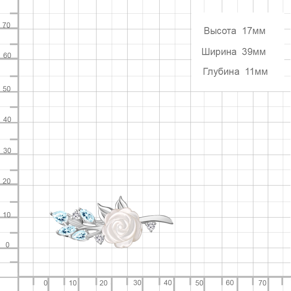 7746602А Брошь из Серебра с поделочным камнем, топазами скай блю, фианитами