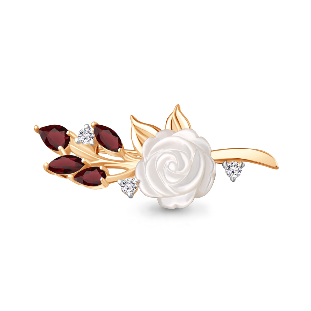 7746603А Брошь из Серебра с гранатами, поделочным камнем, фианитами