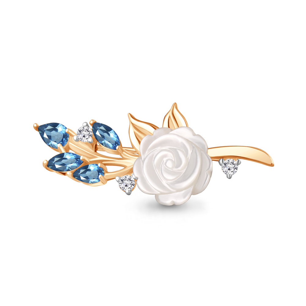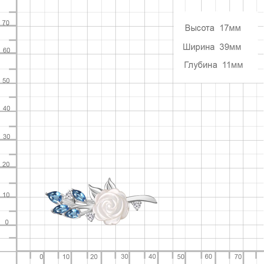7746605А Брошь из Серебра с поделочным камнем, топазами свисс блю, фианитами