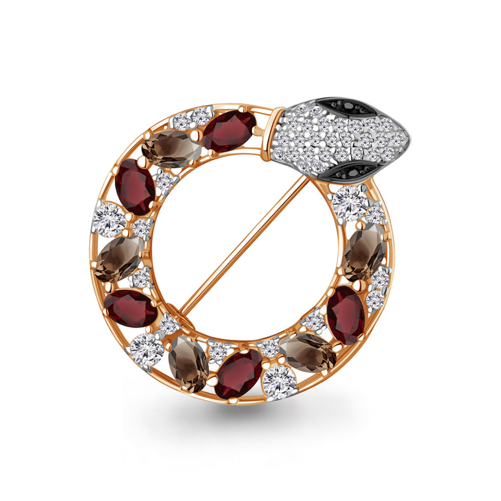 7747836АЧ Брошь из Серебра с гранатами, кварцами дымчатыми, нанокристаллами, фианитами